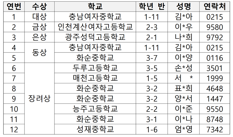 ○ 수상인원 : 12명(대상 1, 금상 1, 은상 1, 동상 2, 장려상 7)