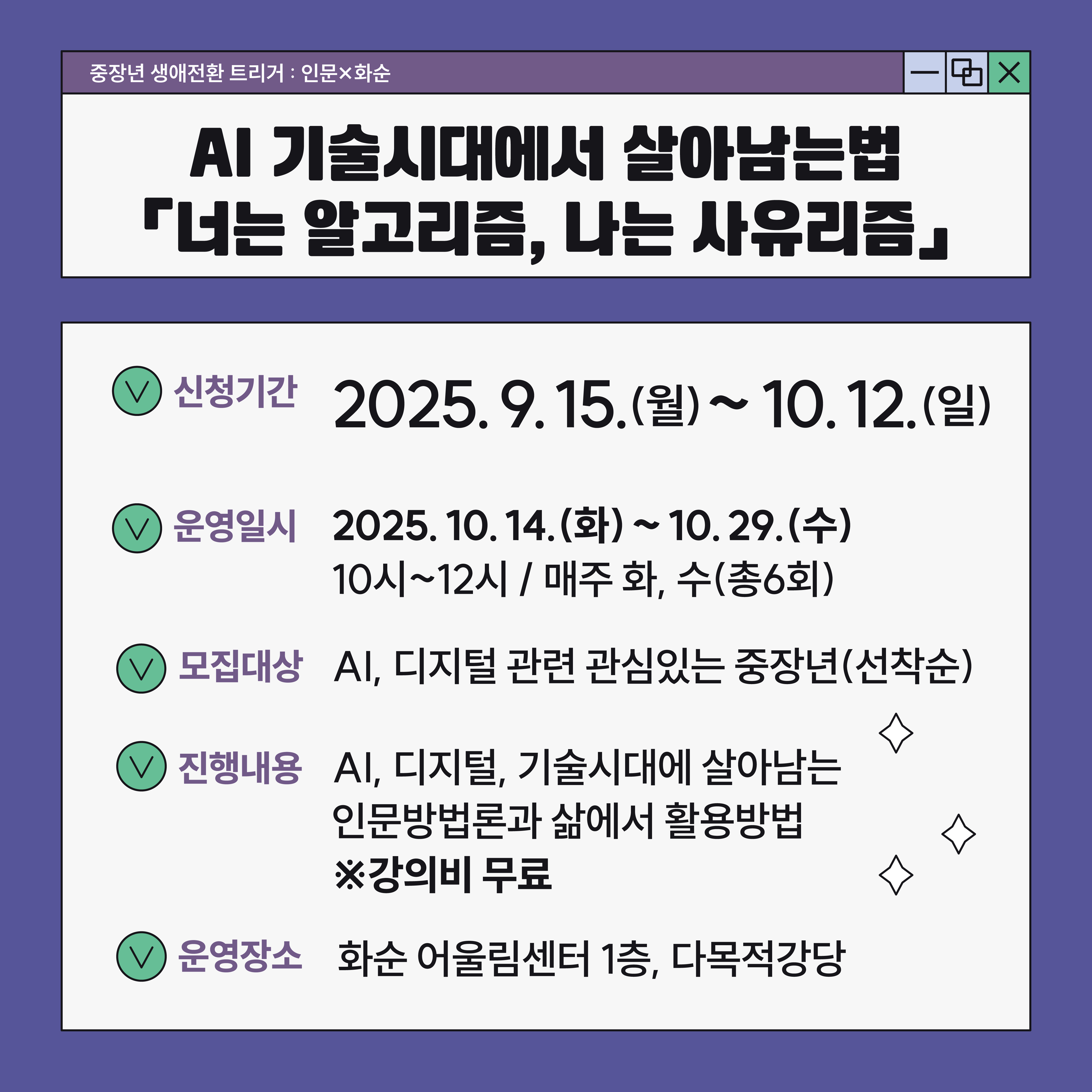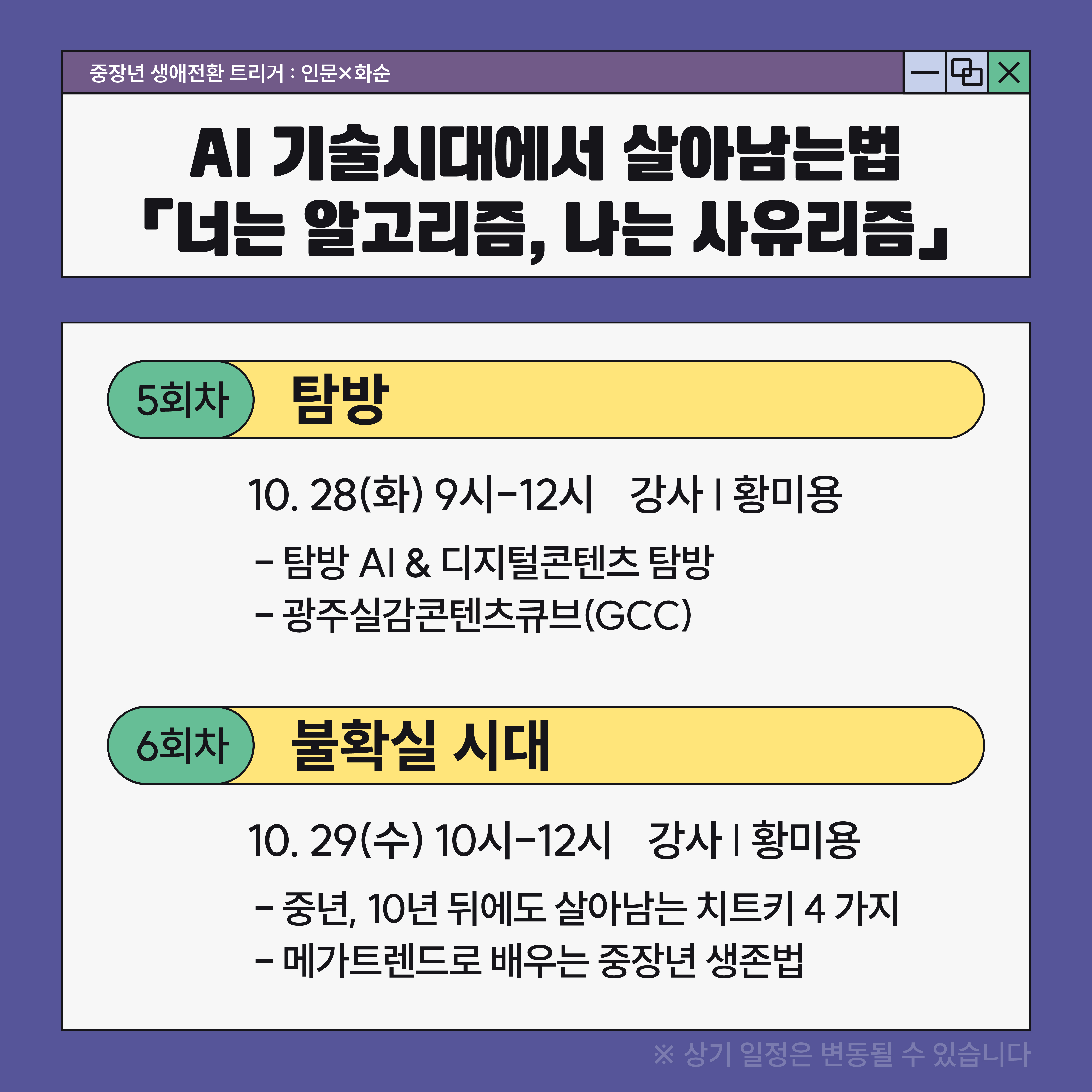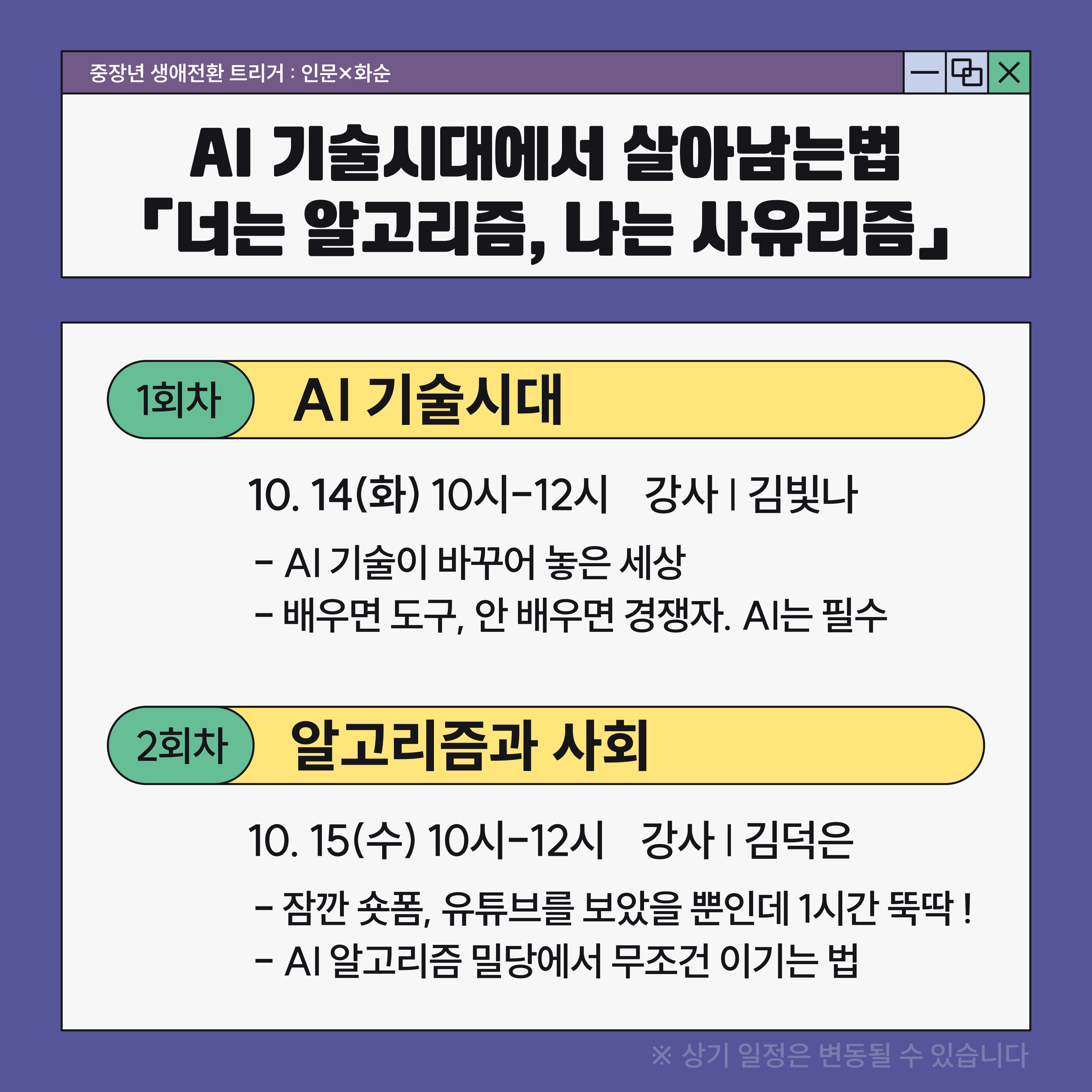 AI에 대한 강의들과 간단한 실습, 탐방까지 ! 빠르게 변해가는 AI시대에 앞서나갈 중장년분들의 많은 관심과 참여 부탁드립니다 !