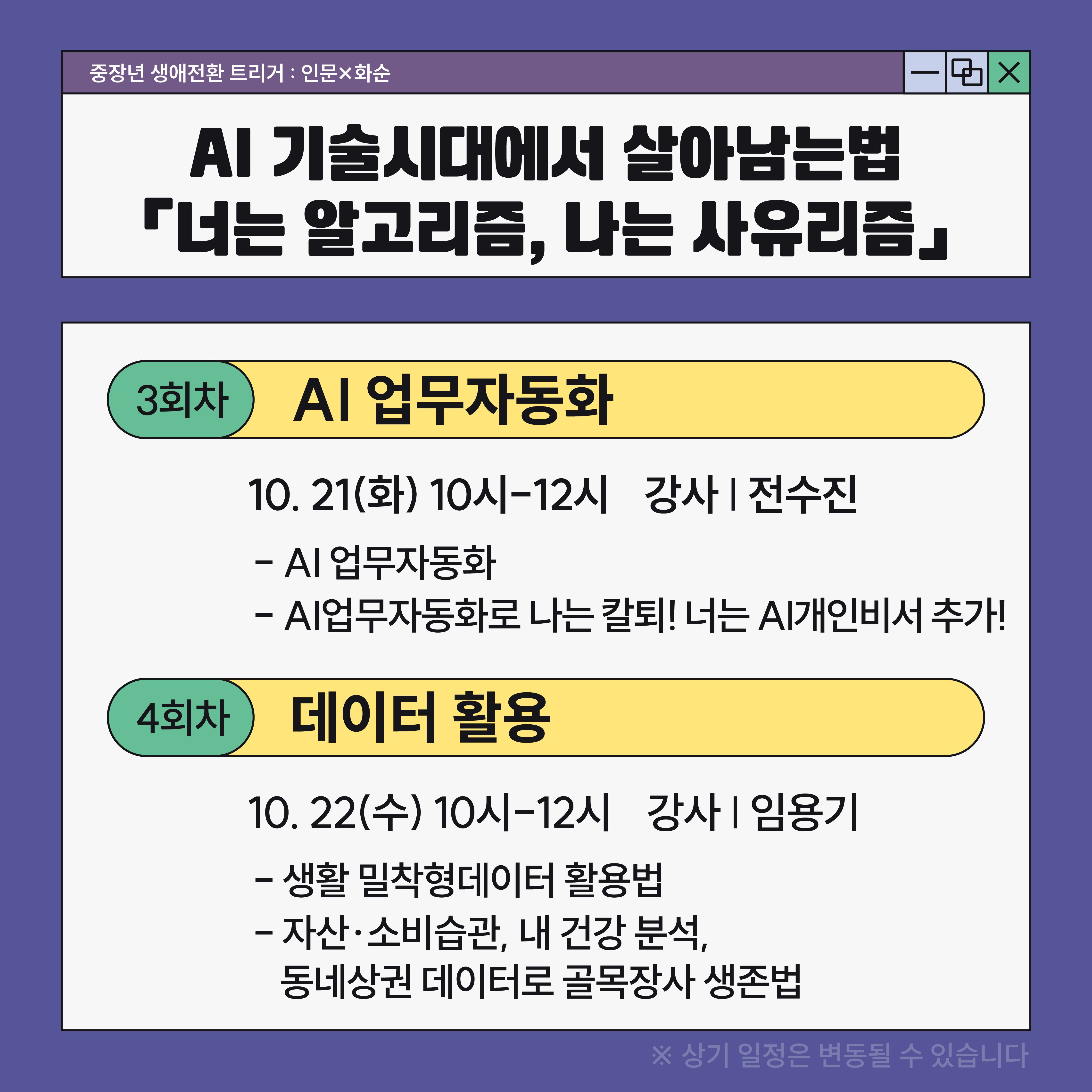 ○ 운영일시 : 2025. 10. 14.(화)~10. 29.(수) 10시~12시/매주 화, 수(총 6회)