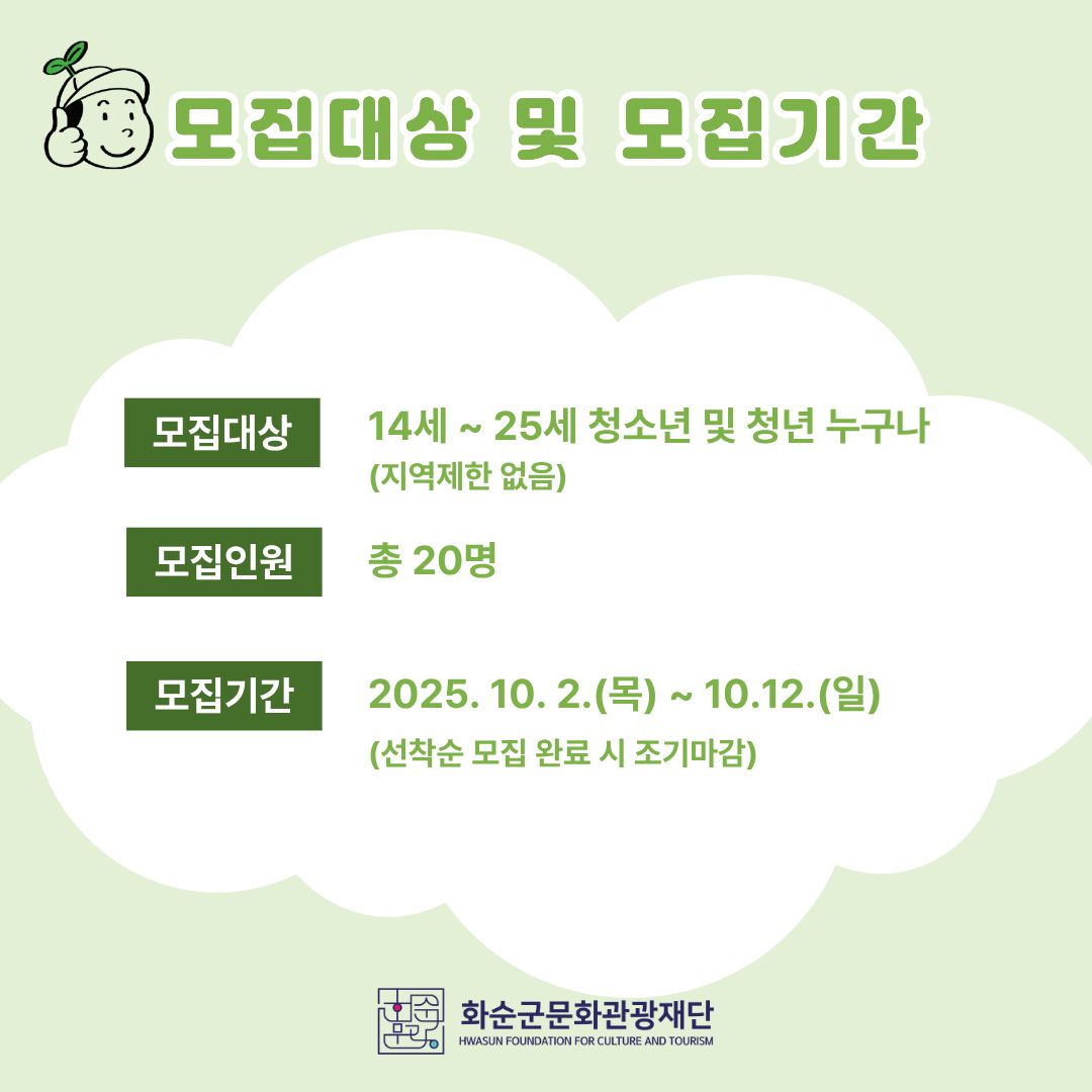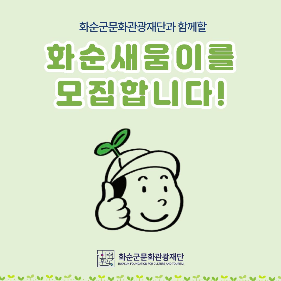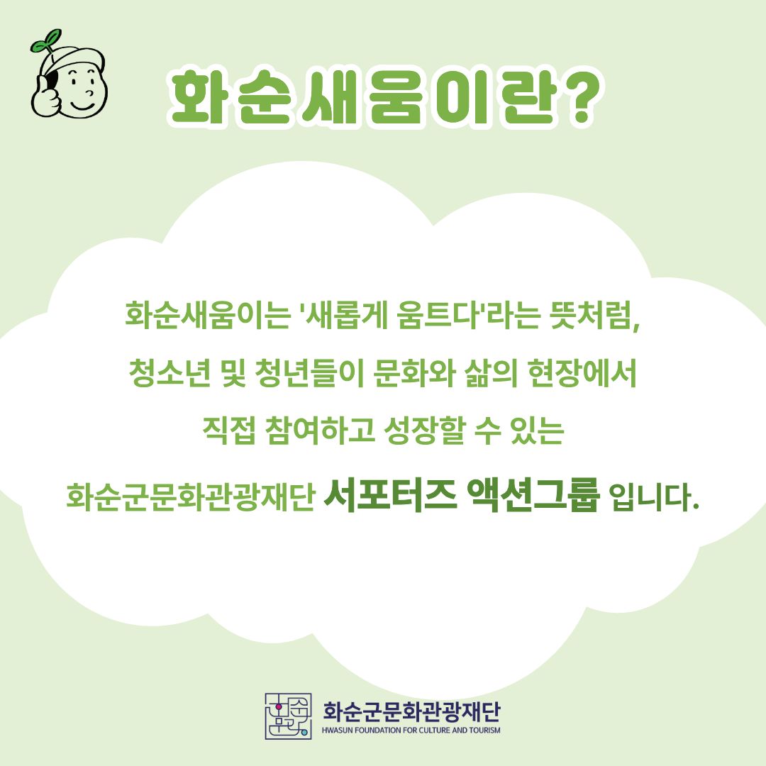 (재)화순군문화관광재단은 새로운 영감과 가능성이 자라는 화순을 미래세대와 함께 만들어가고자 합니다. 이에 청소년과 청년들이 문화와 삶의 현장에서 직접 참여하며 성장할 수 있는 서포터즈 액션그룹 「화순새움이」를 새롭게 모집합니다.