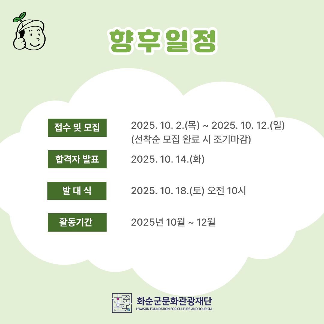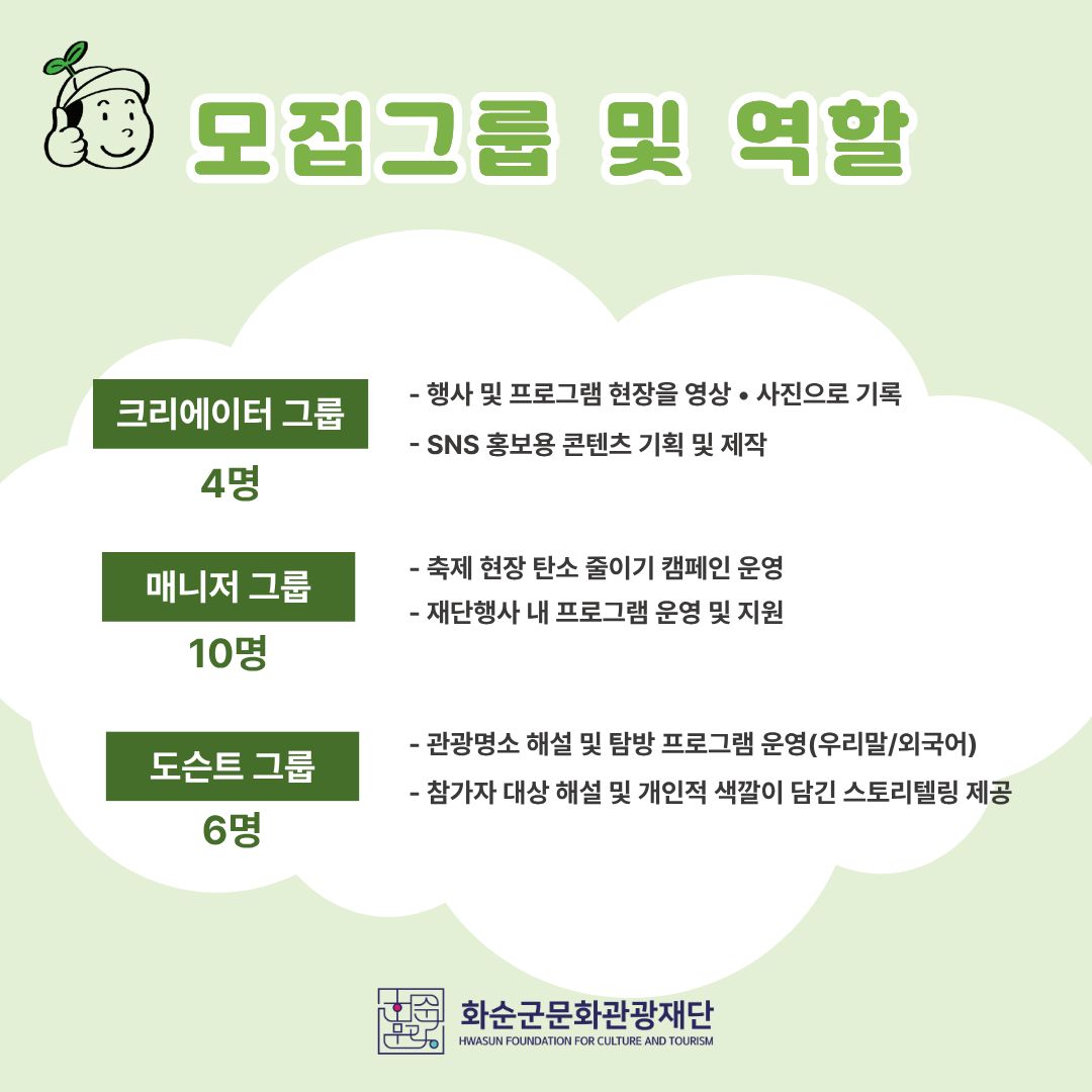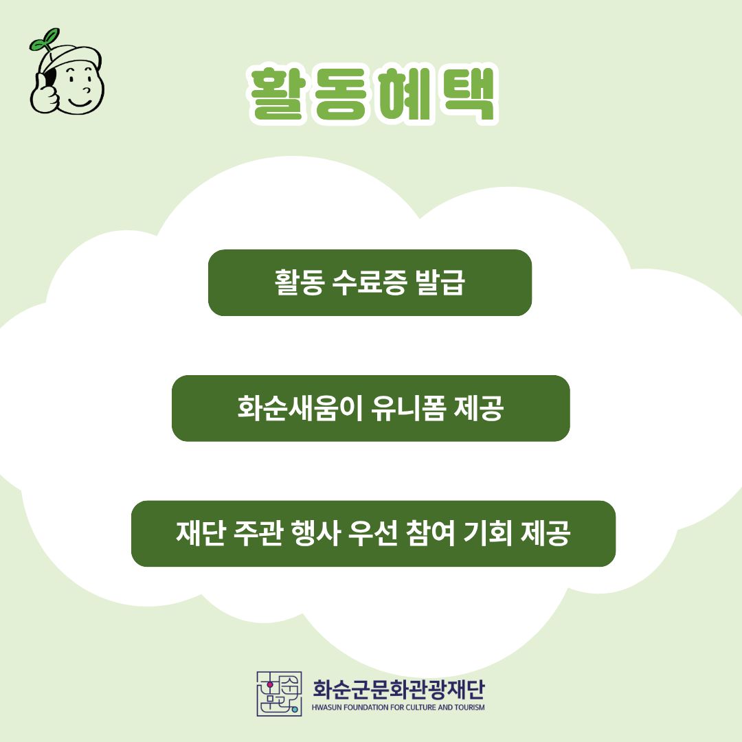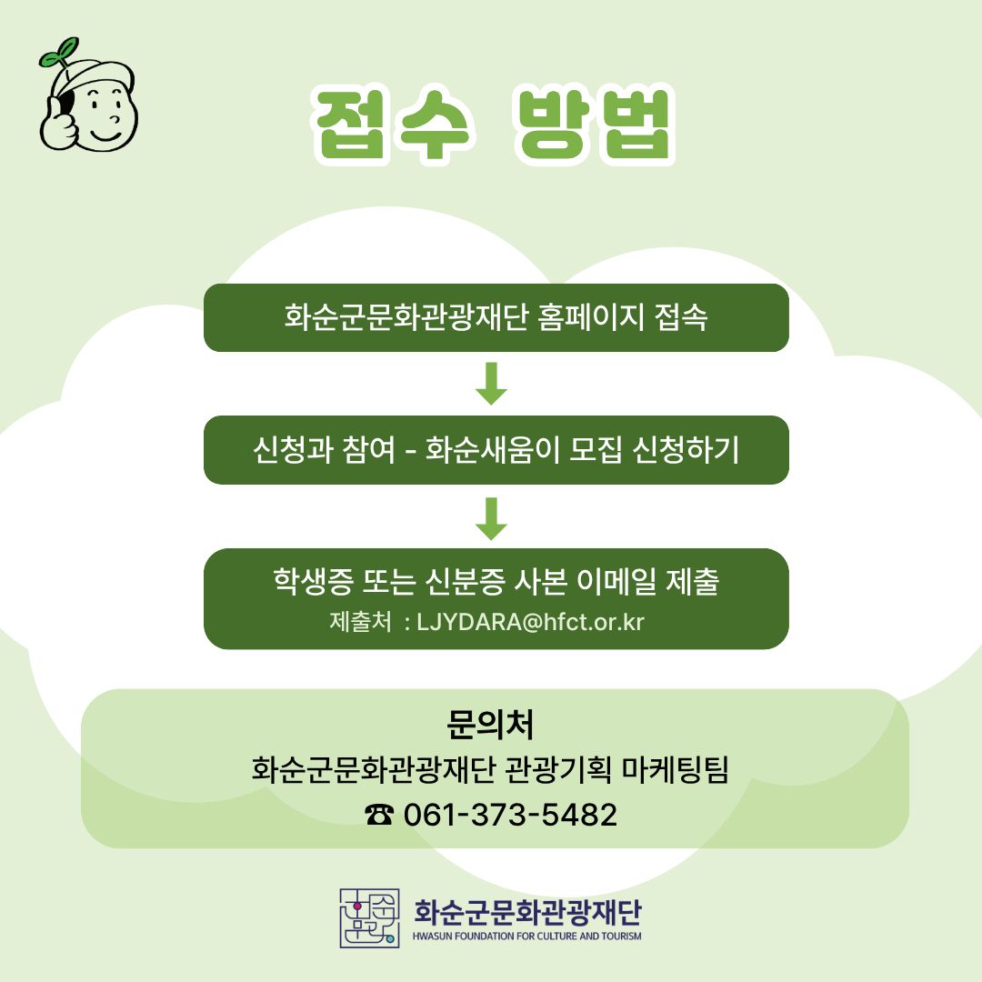 (재)화순군문화관광재단은 새로운 영감과 가능성이 자라는 화순을 미래세대와 함께 만들어가고자 합니다. 이에 청소년과 청년들이 문화와 삶의 현장에서 직접 참여하며 성장할 수 있는 서포터즈 액션그룹 「화순새움이」를 새롭게 모집합니다.